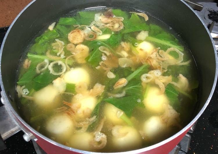 Sayuran hijau yang dimasak praktis, bersama telur dan bakso.